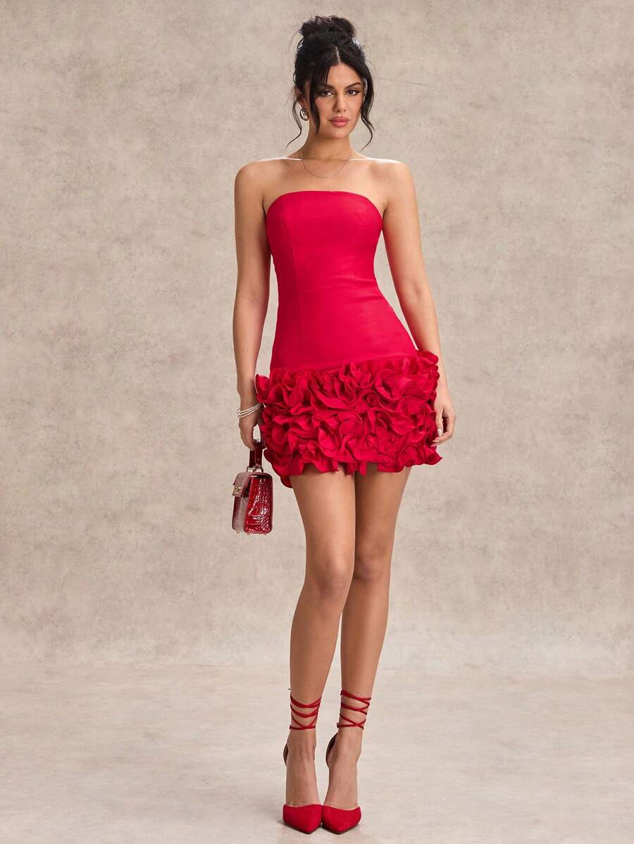 Seu corte mini em formato lápis , aliado à modelagem slim fit , valoriza a silhueta feminina. O sem alças e os detalhes em camadas, apliques e bainha com decote babado acrescentam movimento e um charme extra, tornando o vestido perfeito para elegância como Dia dos Namorados ou festas formais .